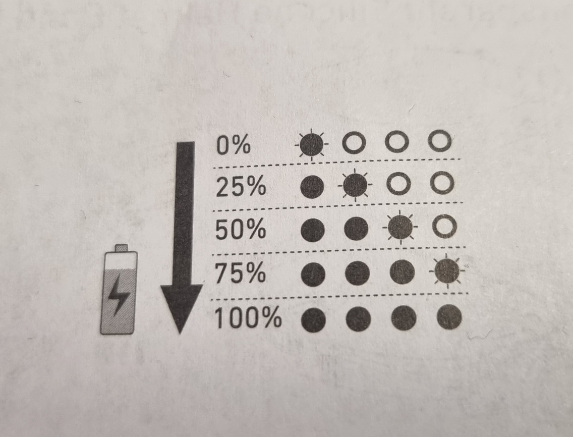 Über das beigefügte USB-Kabel kann die Stirnlampe praktischerweise überall dort aufgeladen werden, wo der Zugang zu einem USB-Port gewährleistet ist (siehe Abbildung 5). Über die Magnetkontakte (Magnetic Charge System) wird das USB-Kabel angeschlossen. Somit ist ein Laden am PC oder über eine Powerbank problemlos möglich. Schwieriger ist ein Laden im Cachemobil bei voller Fahrt. Gelingt es nicht, die Stirnlampe irgendwo zu fixieren, kann es passieren, dass die Magnetkontakte das Ladekabel nicht halten können. Eine Übersicht über den Ladestand des Akkus ist in Abbildung 11